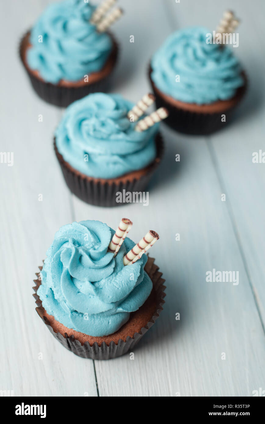 Blue And Brown Cupcakes Blue And Brown Cupcakes / Homemade chocolate chip cookie in the shape of a cupcake filled with vanilla butter cream and mini chocolate chips.