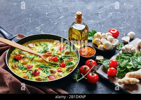 Low Fat Mushroom Curry On Frying Pan Of Coconut Milk With Champignons And Vegetables Fresh Spinach And Cherry Tomatoes On A Dark Concrete Background Stock Photo Alamy - Creamy coconut milk makes a rich and tasty sauce, while nutty brown rice gives amazing spoon the curry over the rice, then roughly chop the coriander leaves and scatter over the top.